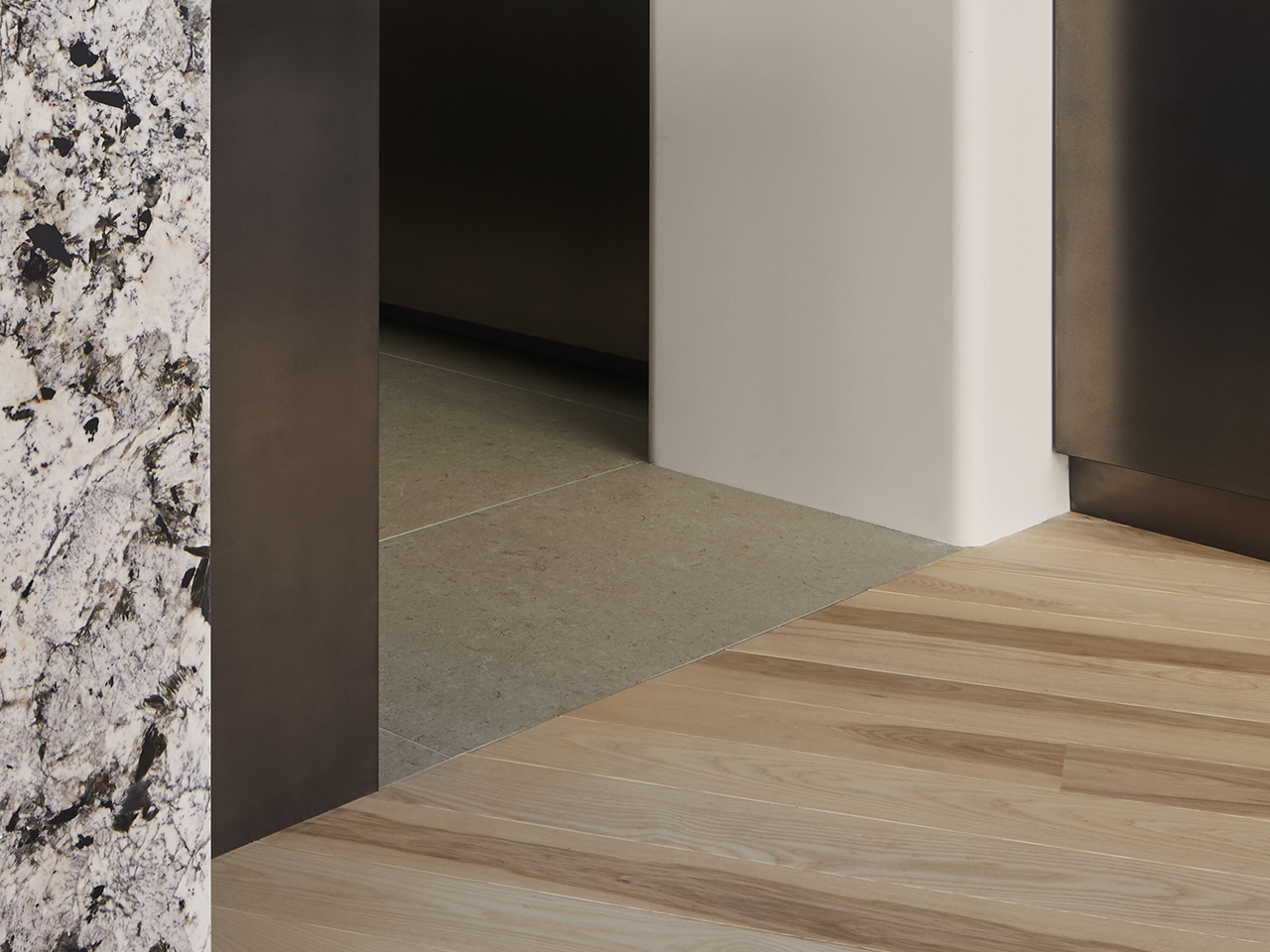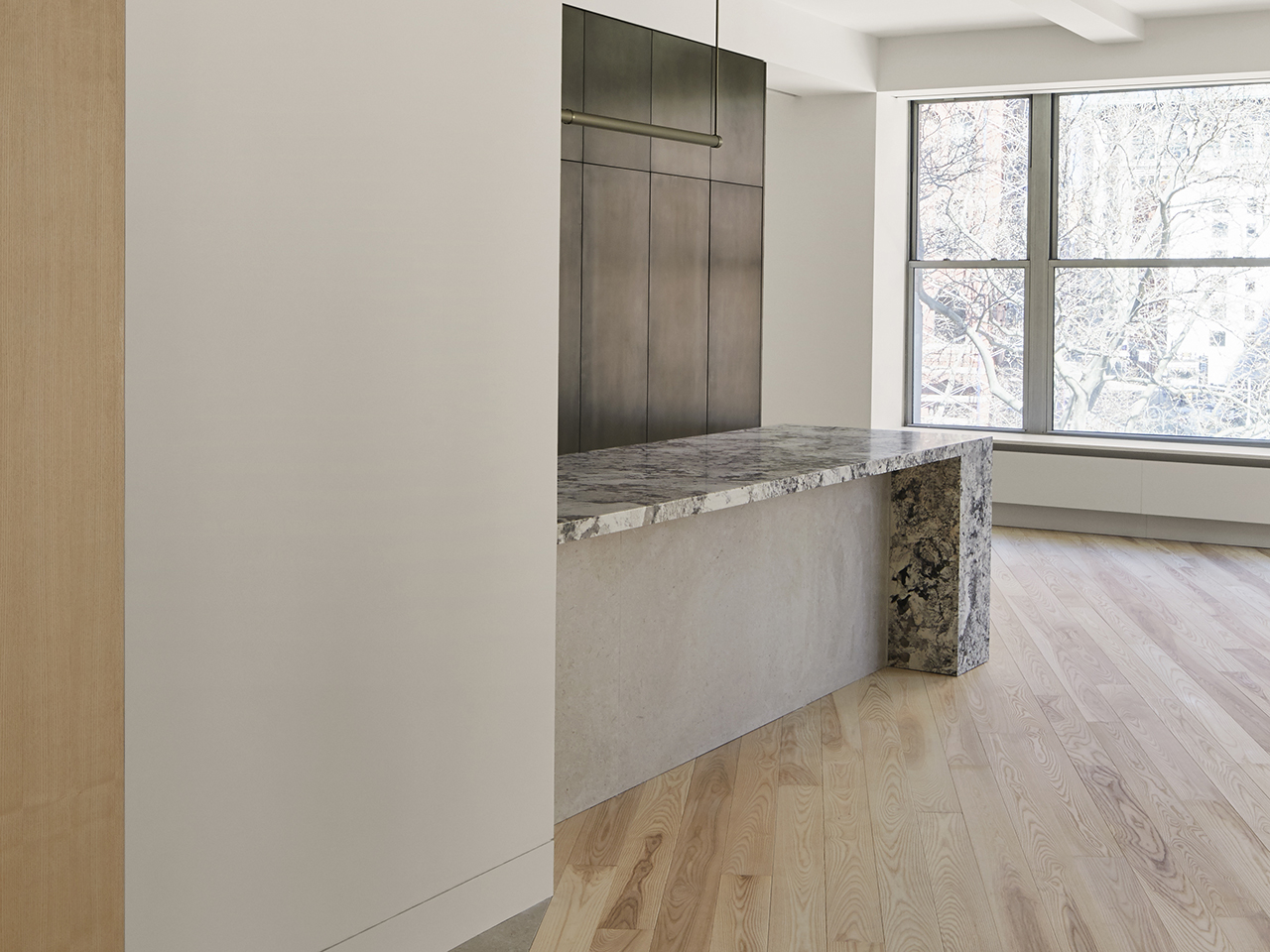 Michael K. Chen’s Aligned Loft in Tribeca celebrates the unique lines of a building that occupies an angular intersection, thus deviating from the usual rectangular shapes of New York City’s gridded layout. A palette of contrasting materials underscores these lines, including our Ash – Neutral flooring: light yet warm it complements the bold lines and rich tones of wood millwork and stone surfaces throughout the space.
